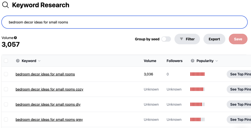 - Suggestions from Pinterest: PinClicks pulls these suggestions directly from Pinterest’s search suggestions. This means I’m seeing what people are actually searching for, like “bedroom decor ideas for small rooms.”